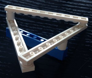 Bottom view of a 5-7-8 construction inside an equilateral triangle. Shows “pylons” used to prevent interference between adjacent studs and angled elements.